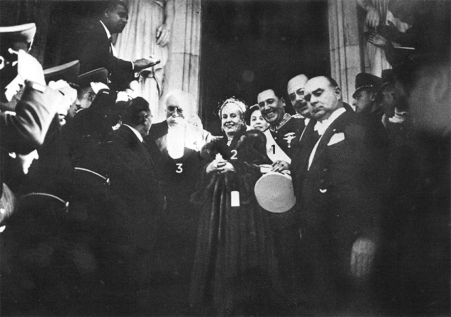 Juan Domingo Perón junto a Eva Duarte en la entrada principal del Congreso Nacional, durante su primer mandato presidencial. Los acompaña el vicepresidente de la Nación, Hortensio Quijano.