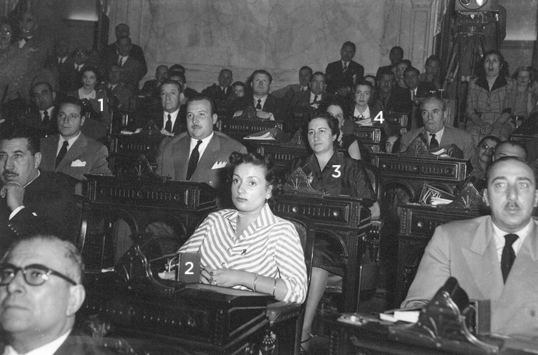 Las diputadas de la Nación Zulema Noemí Pracánico (1), María Carmen Caviglia (2), Angélica Esperanza Dacunda (3) y Judith Élida Acuña (4), junto a otros legisladores, en la exposición sobre el Segundo Plan Quinquenal realizada por el presidente de la Nación, general Juan D. Perón, el 1° de diciembre de 1952, en el recinto de la H. Cámara de Diputados.